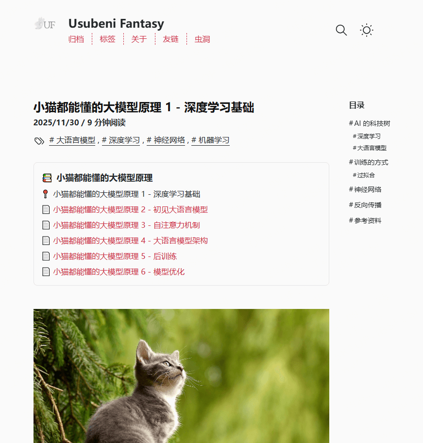 slug: "kitten-large-language-model-1"publishDate: "2025-11-30T15:01:45.814Z"title: "小猫都能懂的大模型原理 1 - 深度学习基础"tags: ["大语言模型", "深度学习", "神经网络", "机器学习"]description: "用最简单易懂的语言解释大语言模型的基本原理,从深度学习基础到神经网络训练,包含梯度下降、反向传播等核心概念,适合初学者的AI入门教程。"series: "小猫都能懂的大模型原理"seriesOrder: 1useKatex: true相关文章