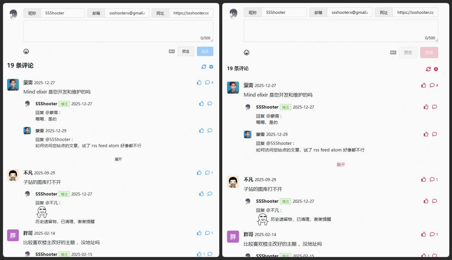 #twikoo { --tk-primary-color-rgb: 203, 42, 66;}:root[data-theme="dark"] #twikoo { --tk-primary-color-rgb: 232, 120, 142;}太好了,UI 终于统一起来了,从 cactus Fork 出来也这么久了,更新了不少,晚点也开源一下好了🤗